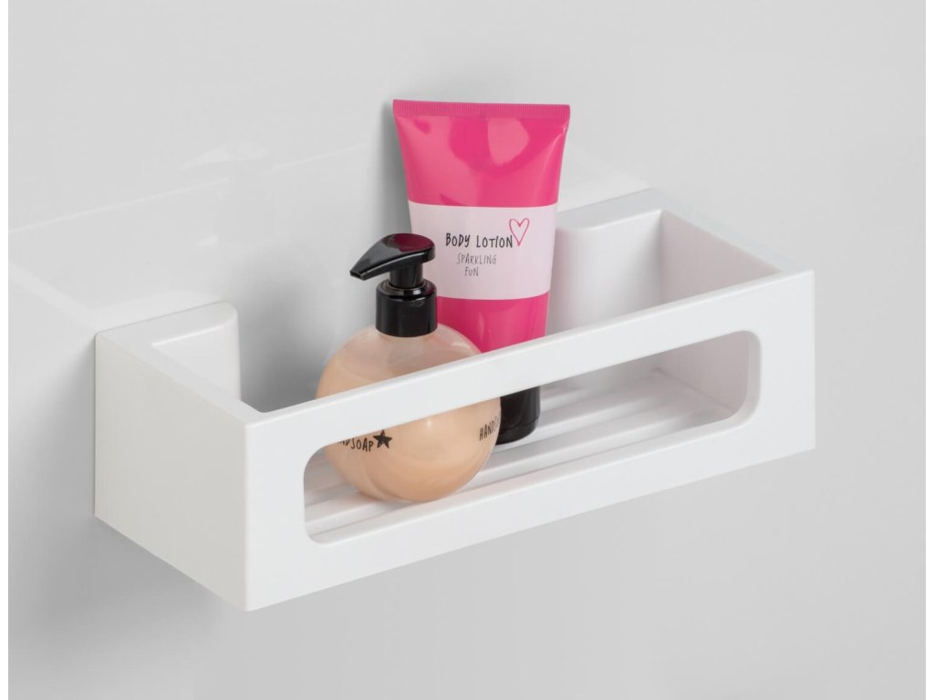Oszczędzająca miejsce, dekoracyjna półka łatwo montuje się do każdej ściany i utrzymuje wszystkie Państwa kosmetyki w zasięgu ręki. Szampon, żel pod prysznic i płyn do kąpieli są teraz przechowywane w przejrzystym miejscu. Dzięki temu poręczna półka naścienna jest przydatnym pomocnikiem w łazience.