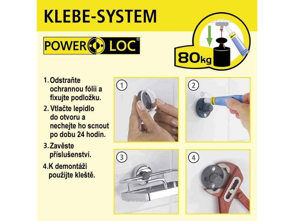Seria mocowań Power-Loc® charakteryzuje się wyjątkowo mocnym dopasowaniem do wszystkich odpowiednich powierzchni, takich jak płytki, kamień naturalny, szkło, beton, metal, drewno i plastik. System mocowania trzyma się mocno nawet na szorstkich i lekko nierównych powierzchniach bez żadnych problemów. Dzięki specjalnie opracowanemu jednoskładnikowemu klejowi pochodzącemu z badań high-tech, każdy z haków mocujących może być trwale poddany sile rozciągającej do 80 kg.