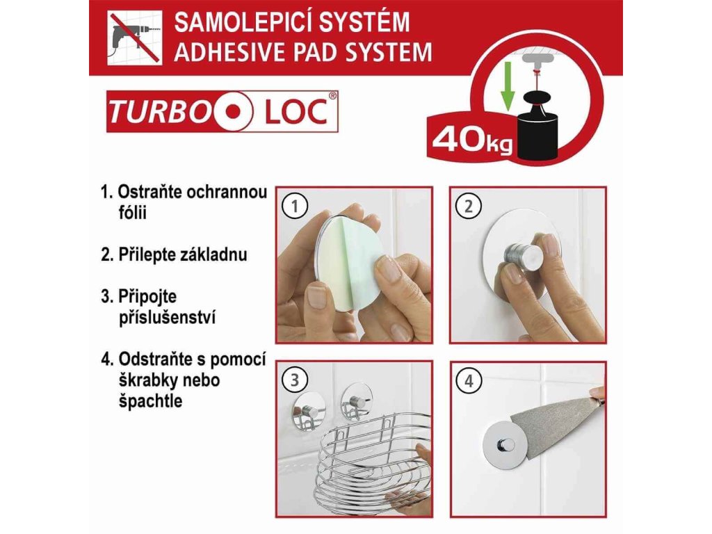 System montażu ściennego Turbo-Loc® oferuje dekoracyjne akcesoria łazienkowe i półki, które po prostu mocuje się do ściany - nie wymaga to wkrętów, wiercenia ani kołków.