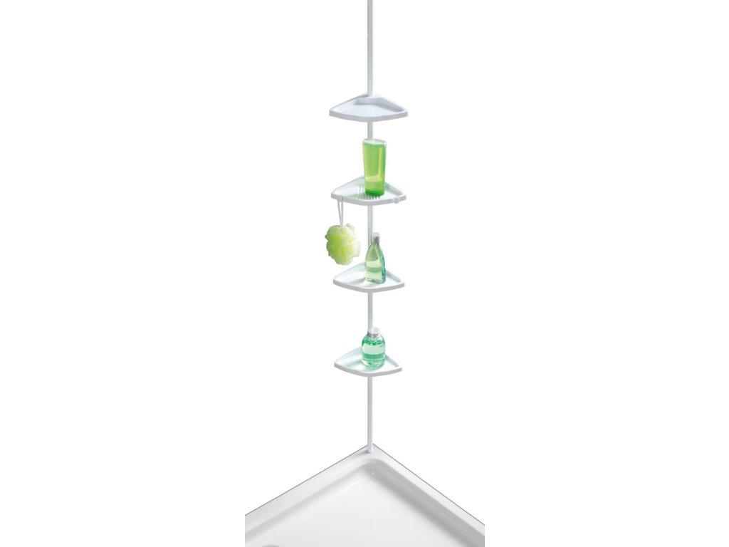 Stojak z czterema półkami o regulowanej wysokości w kolorze białym oferuje mnóstwo miejsca na żele pod prysznic, szampony, mydła, gąbki lub inne akcesoria łazienkowe.