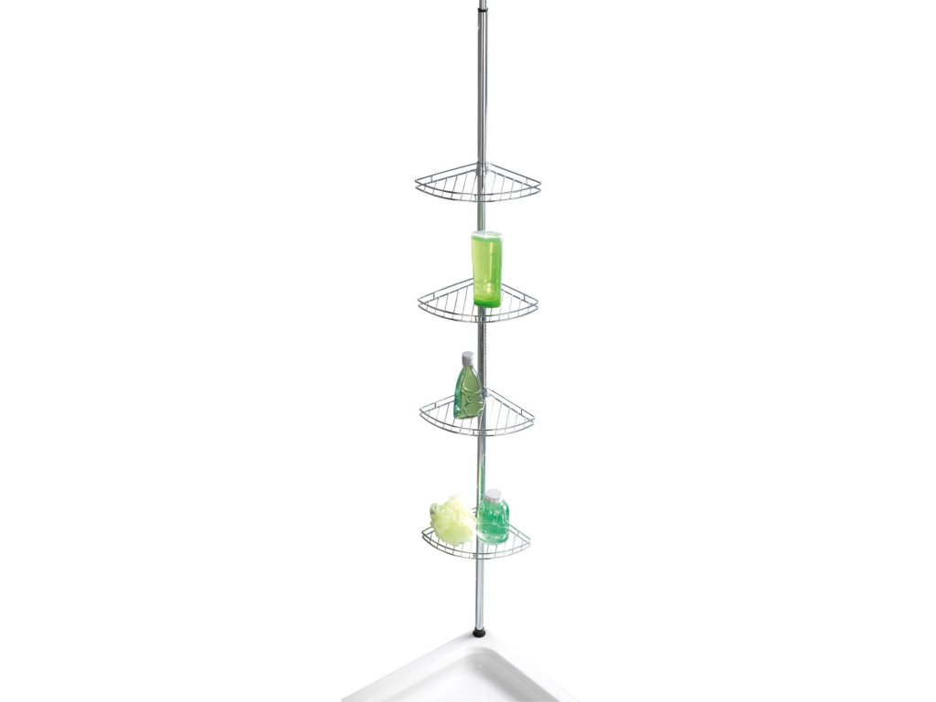 Stojak z czterema drucianymi koszami o regulowanej wysokości oferuje mnóstwo miejsca na żele pod prysznic, szampony, mydła, gąbki lub inne akcesoria łazienkowe.